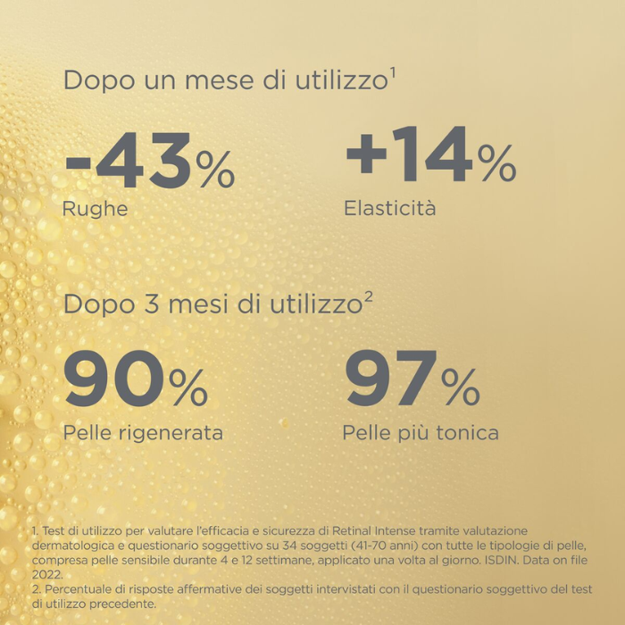 ¹ Test di utilizzo per valutare l’efficacia e la sicurezza tramite valutazione dermatologica e questionario soggettivo di Retinal Intense in 34 soggetti (41-70 anni) con tutte le tipologie di pelle, compresa pelle sensibile, per 4 e 12 settimane, applicato una volta al giorno. ISDIN, data on file 2022.