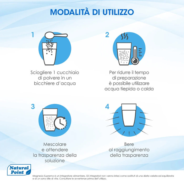 Il prodotto è da intendersi da sciogliere in acqua naturale, ed assumere immediatamente la soluzione ottenuta.