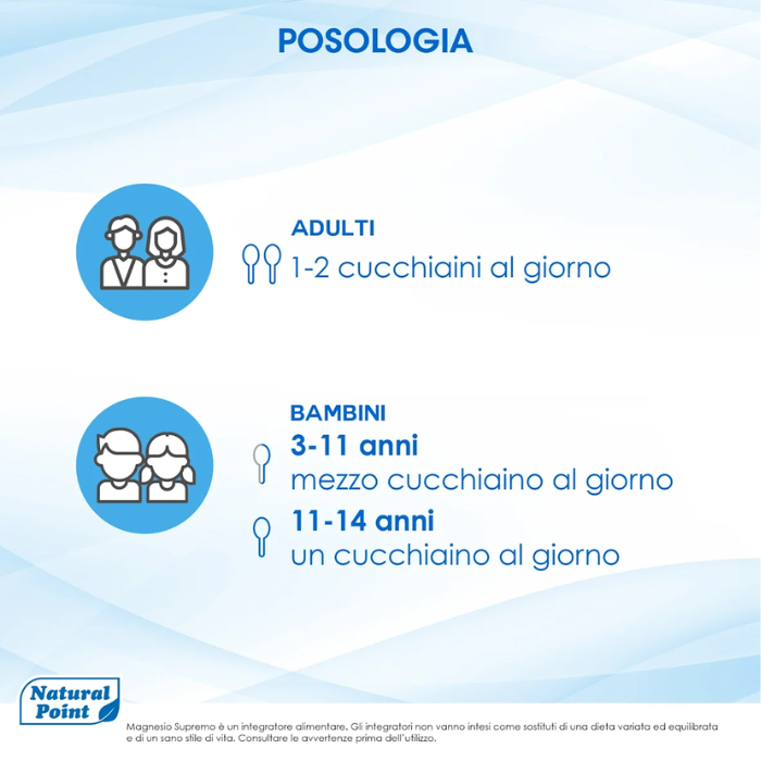 Magnesio Supremo può essere assunto in qualsiasi momento della giornata, preferibilmente lontano dai pasti principali. La posologia consigliata varia a seconda dell'età: