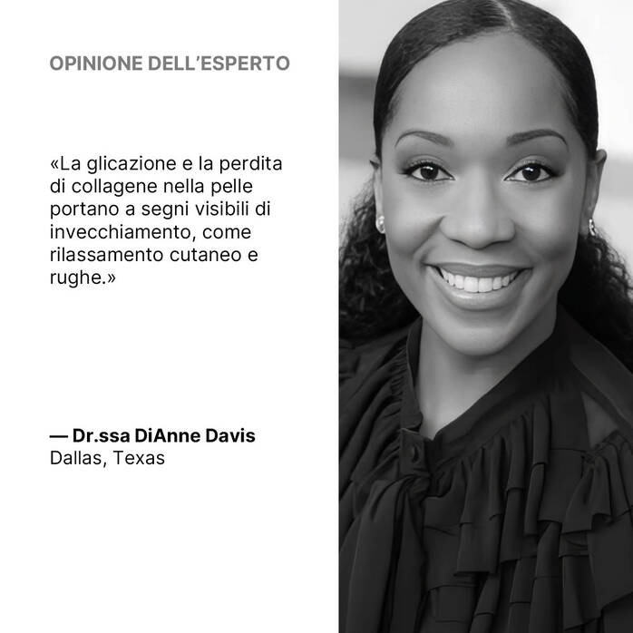 La glicazione e la degradazione di collagene provocano perdita di elasticità, lassita cutanea e rughe. La glicazione è un processo naturale che accelera i segni visibili dell'invecchiamento. Durante il processo di glicazione, gli zuccheri in eccesso si legano alle proteine che sostengono la pelle (come il collagene e l'elastina) e formano i prodotti finali della glicazione avanzata (A.G.E.). Gli A.G.E. indeboliscono e degradano il collagene, provocando rughe e lassità cutanea.